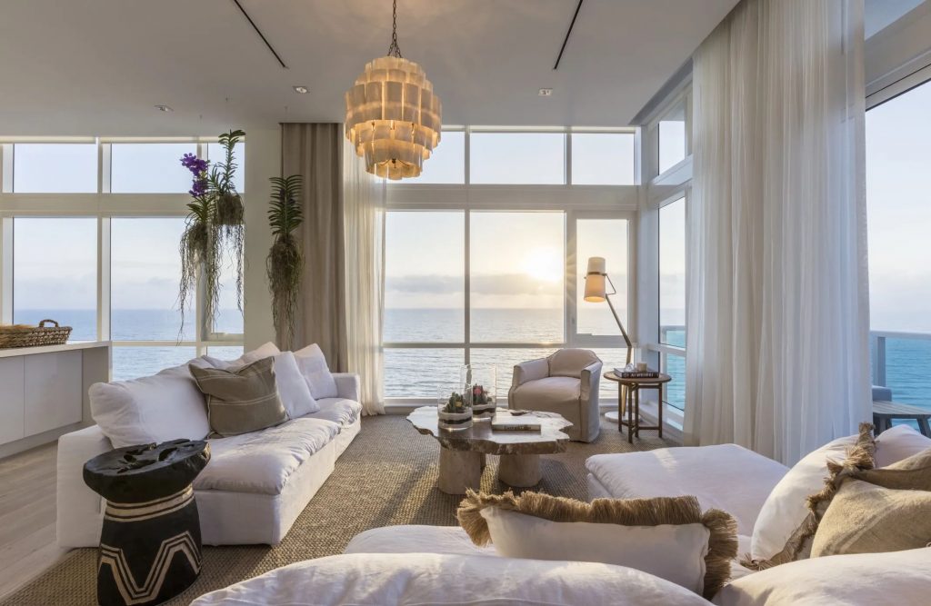 Inspired by nature, 1 Homes seamlessly translates the sensory experience of its oceanfront environment into beautiful spaces brought to life by internationally renowned Brazilian interior designer Debora Aguiar. The celebration of living on the ocean is expressed through the graceful twist of driftwood furnishings, the abundance of plant life, and the continuous feeling of ocean breezes and sunlight sweeping through oversized windows and terraces. Owners will enjoy all the privileges and conveniences of hotel living while having access to a full suite of services and amenities that transform day-to-day living into an extraordinary and unforgettable experience including access to the full-service 14,000 sq. ft. Bamford Haybarn Spa and Spartan fitness center, eight restaurants, four elevated oceanfront swimming pools, Tesla house car service and more. Fully furnished Residences and Penthouses are available for immediate occupancy starting at $3.1 million.