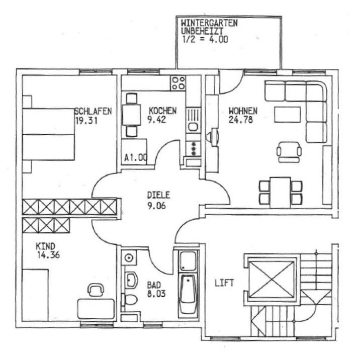 Die helle Wohnung besteht aus Flur, Bad, Küche, Wohnzimmer und 2 Schlafzimmern. Aus dem Wohnzimmer erreichen Sie den großen sonnigen Wintergarten mit Ausrichtung nach Westen. Die Wohnung ist mit einer Einbauküche ausgestattet. Hier ist jedes Zimmer mit mindestens einem Fenster versehen.